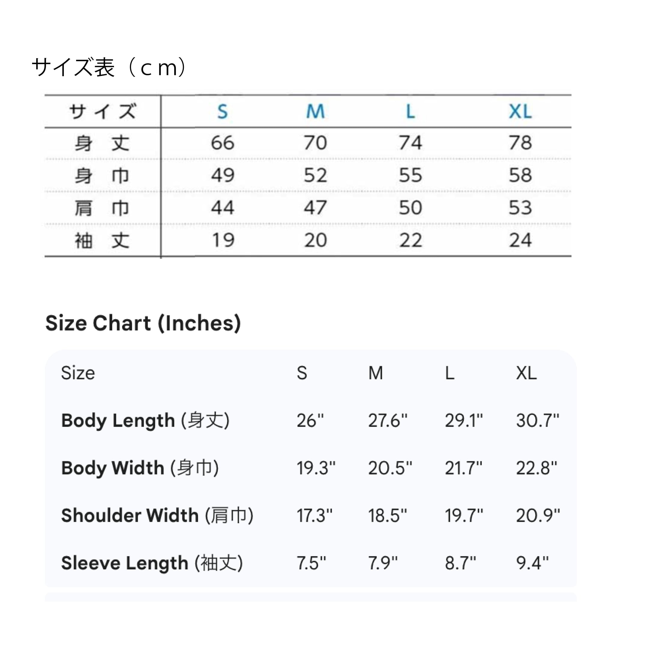 L 身丈 73 身幅 55 肩幅 50 袖丈 22