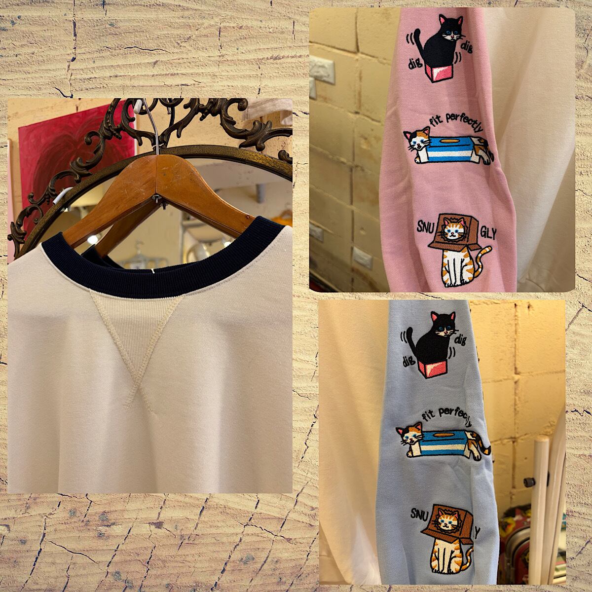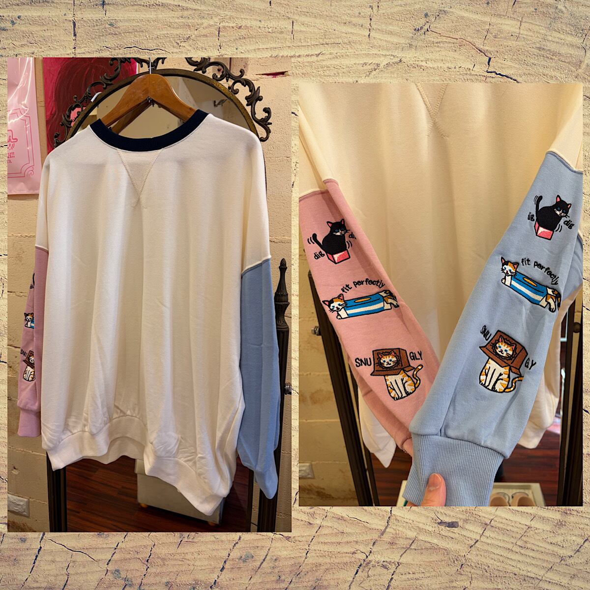箱と遊ぶ猫たちを刺繍したユニークなBIGトレーナーが登場!