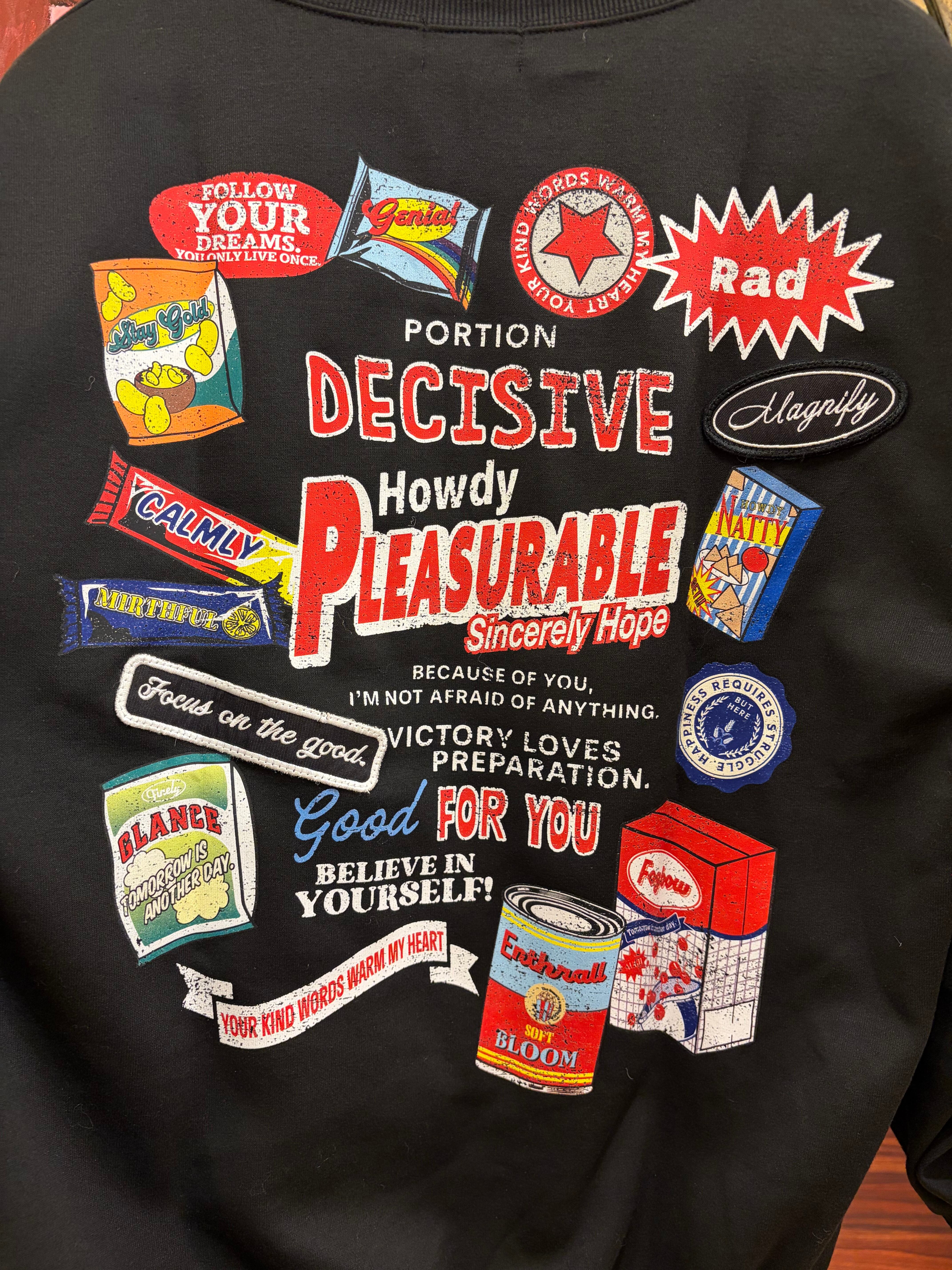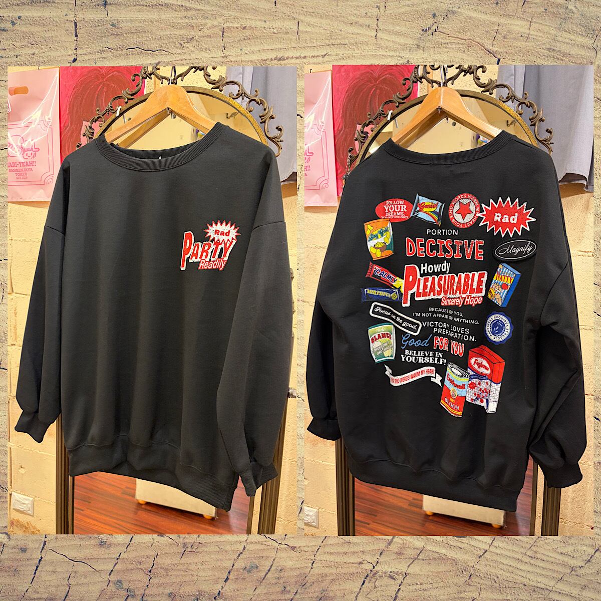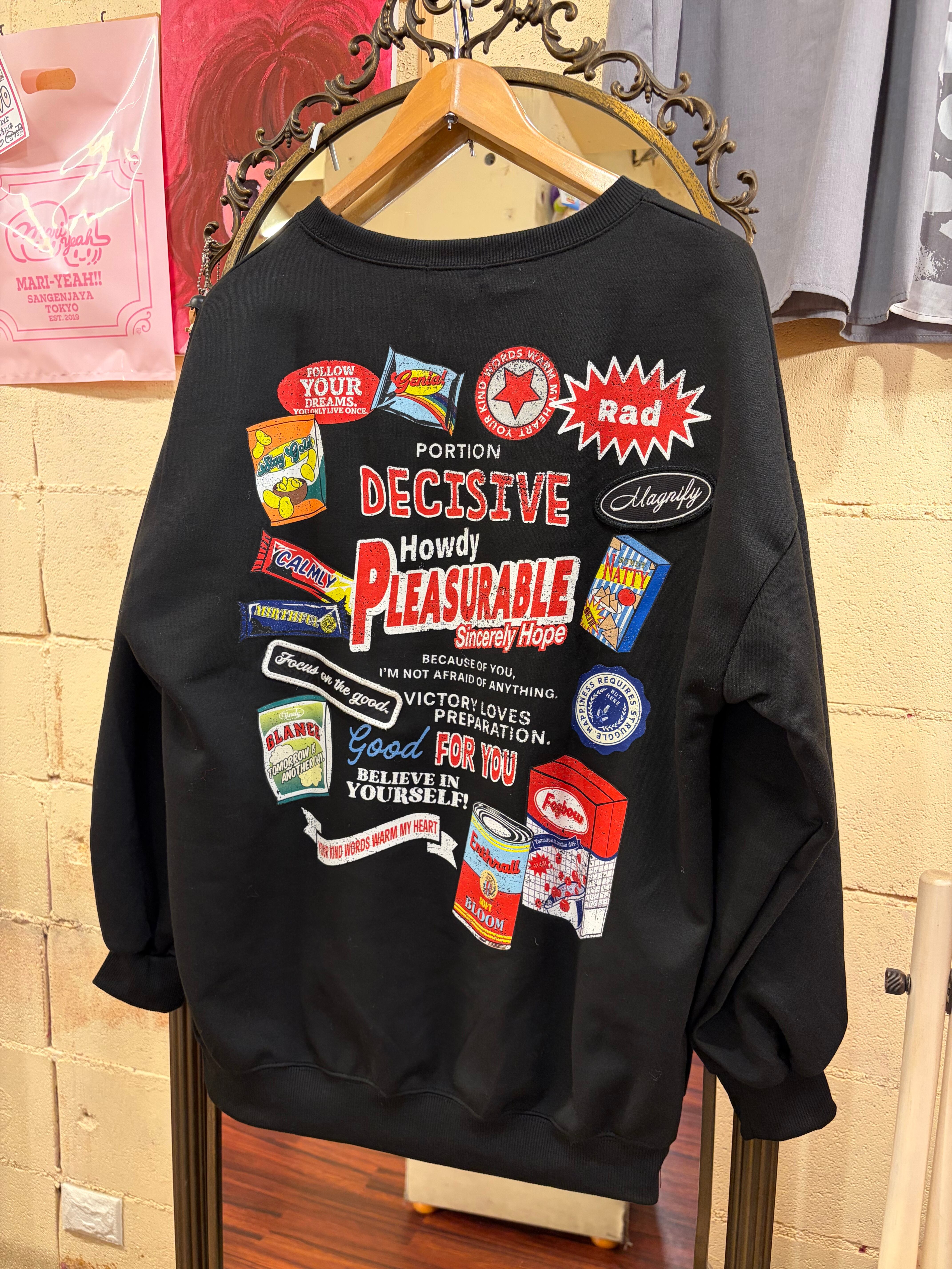 お菓子やシリアルなど食品のパッケージを並べたプリントにワッペンデザインを落とし込んだ一枚はパッと見ではどれがワッペンでプリントなのか判別できないくらいリアルなプリント具合が秀逸さ◎