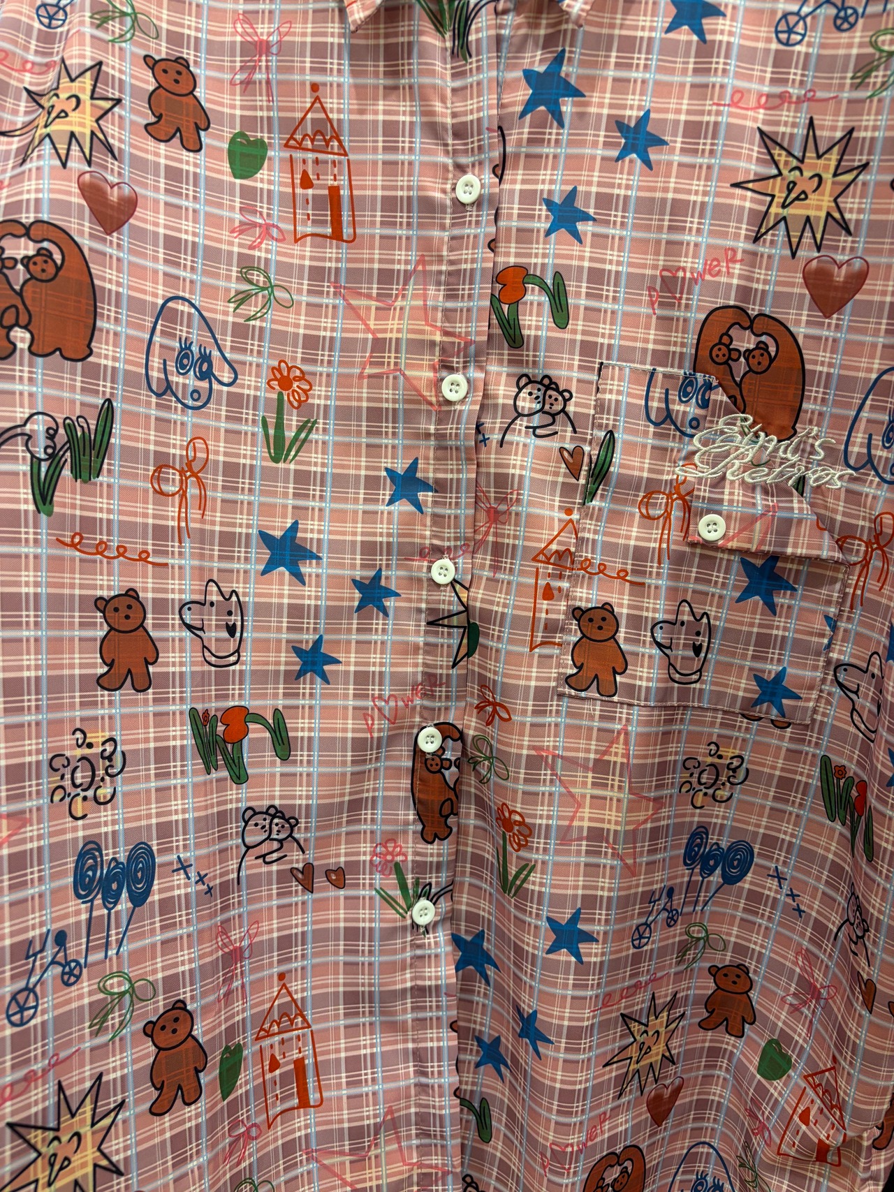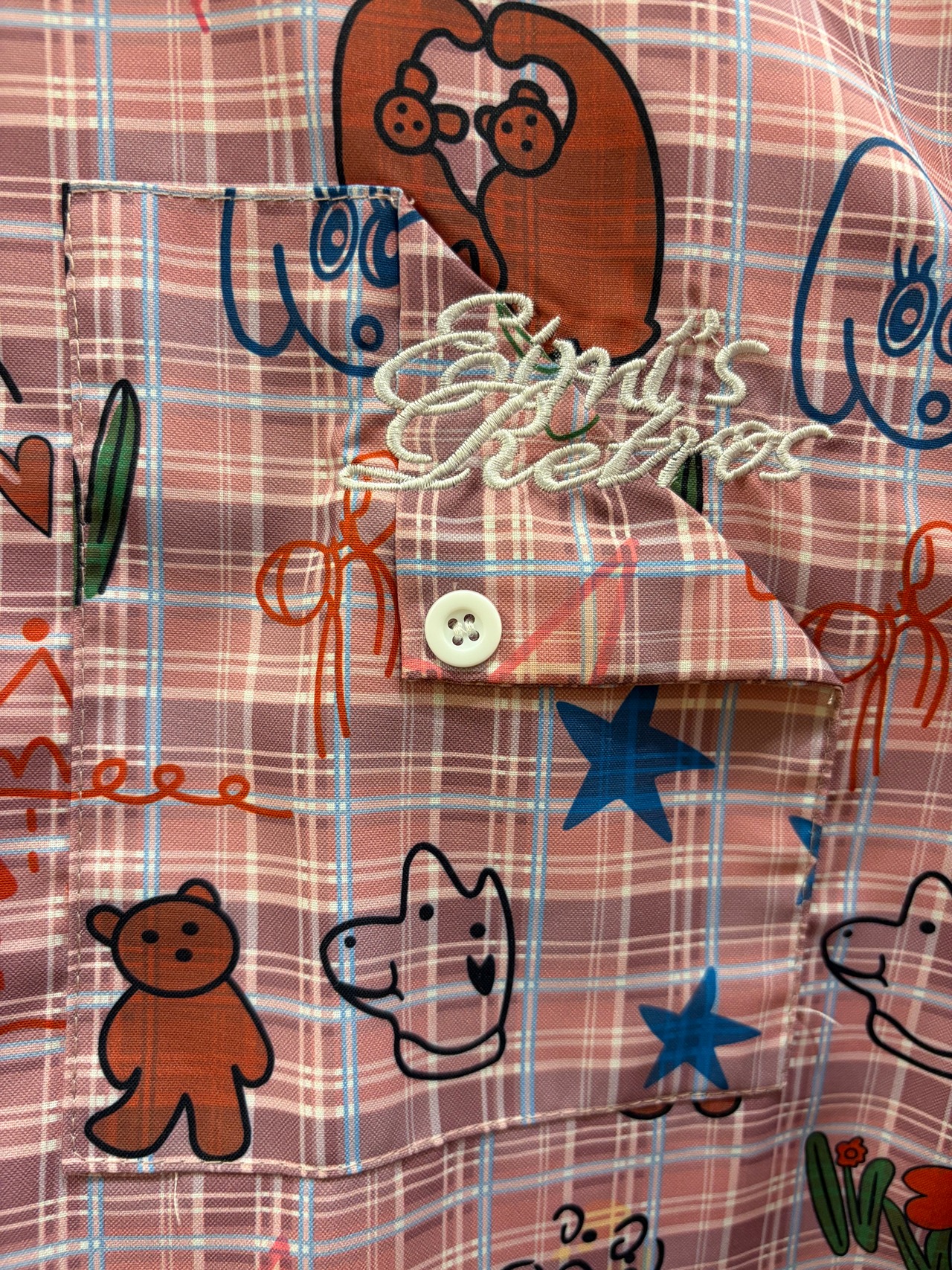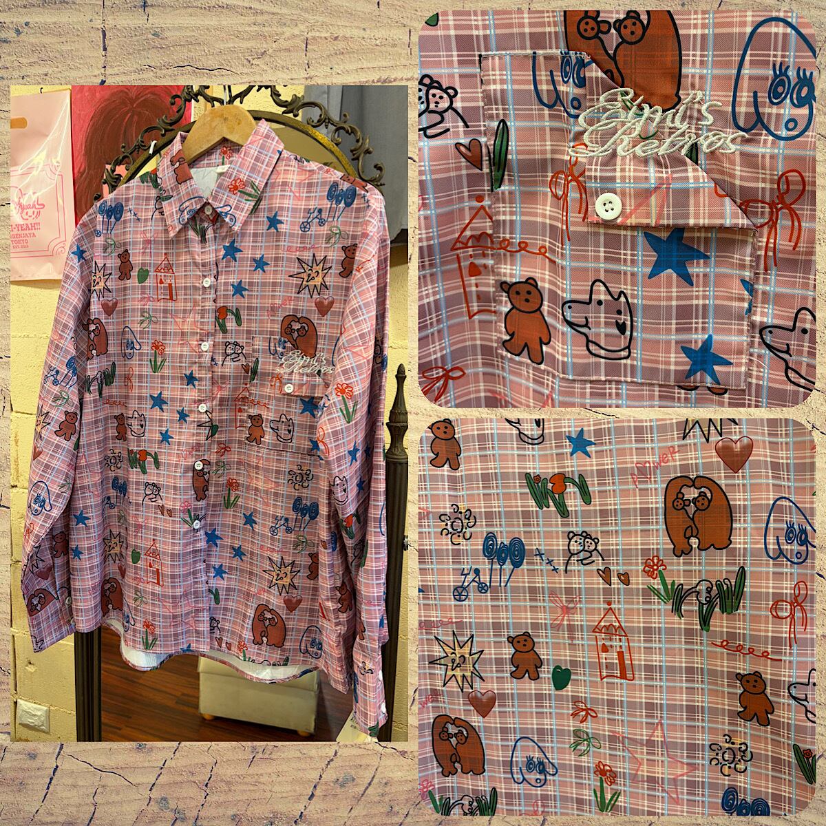 カラフルでキュートなモチーフがちりばめられた長袖シャツ。